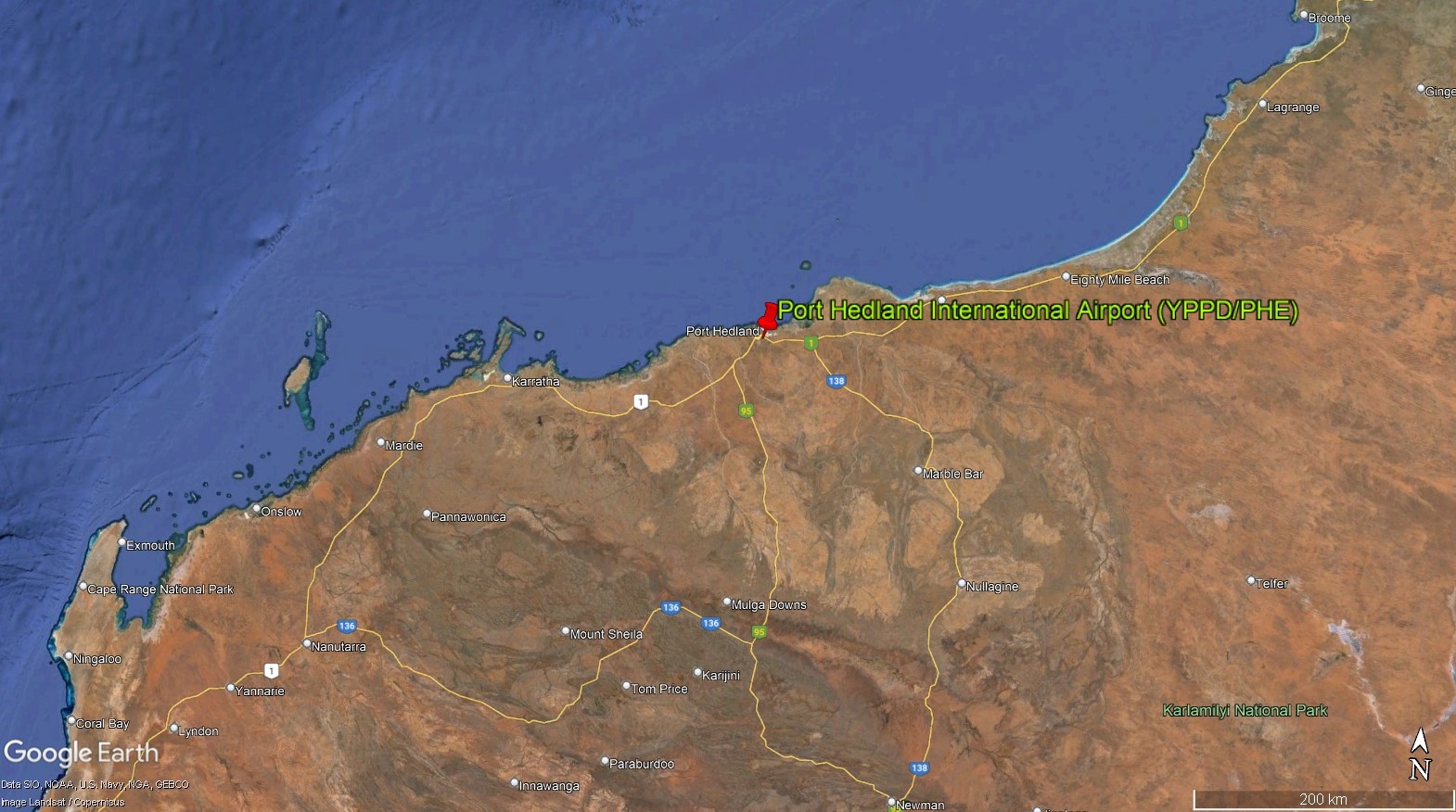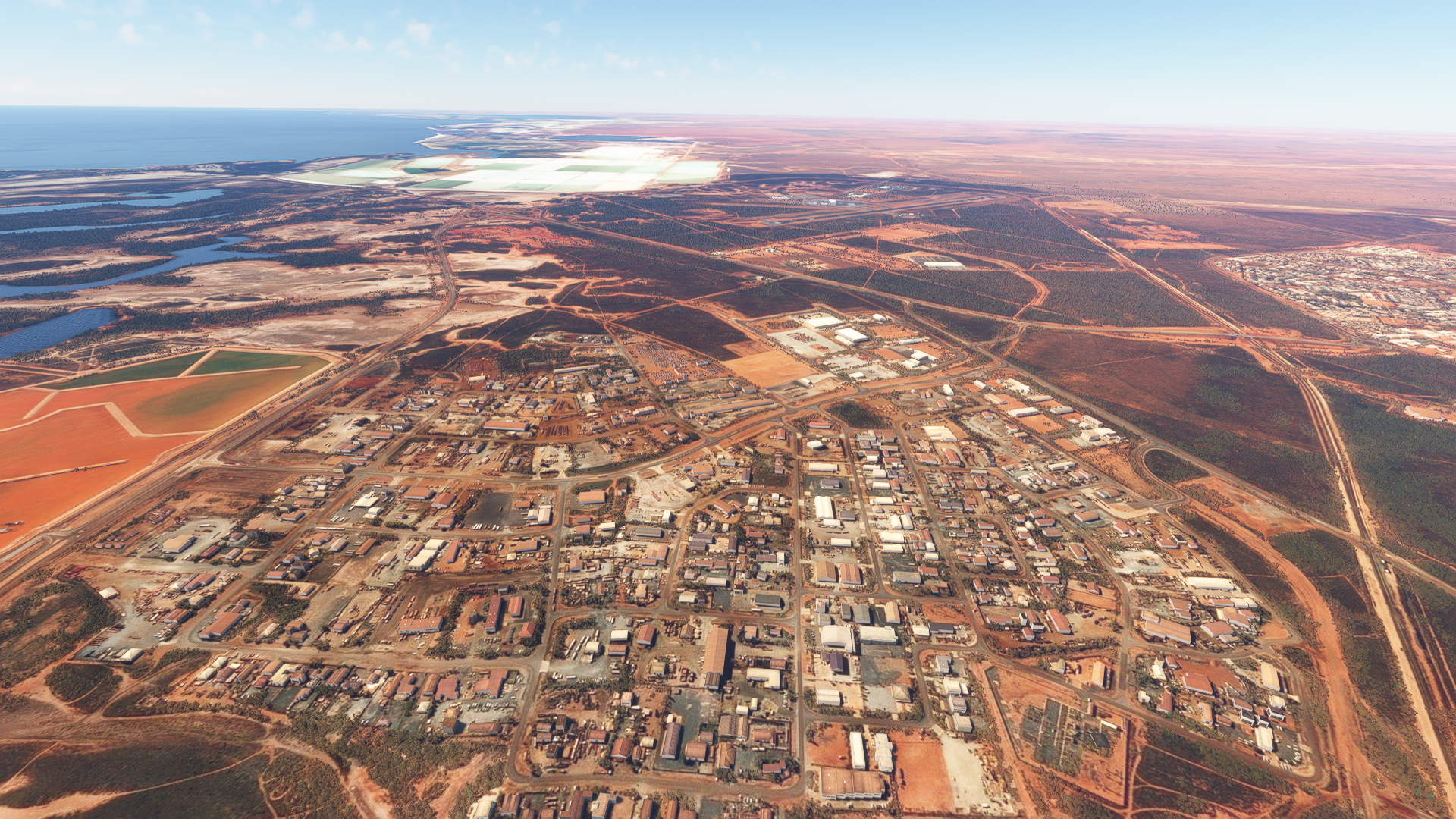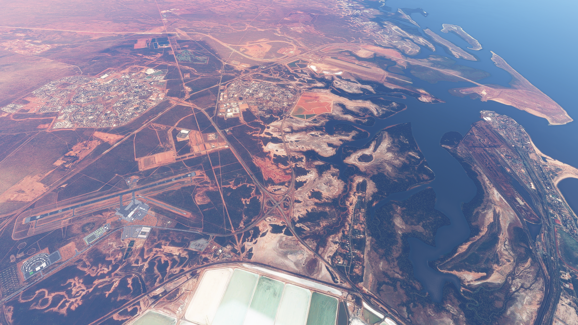A shot containing Port Hedland International Airport, South Hedland and Wedgefield, 2 localities which make up the town of Port Hedland, as well as the port of Port Hedland. BHP’s Port Haven village and the Compass Group’s ESS Waypoint Village which provide accommodation for FIFO workers are also visible, located conveniently right next to the airport.