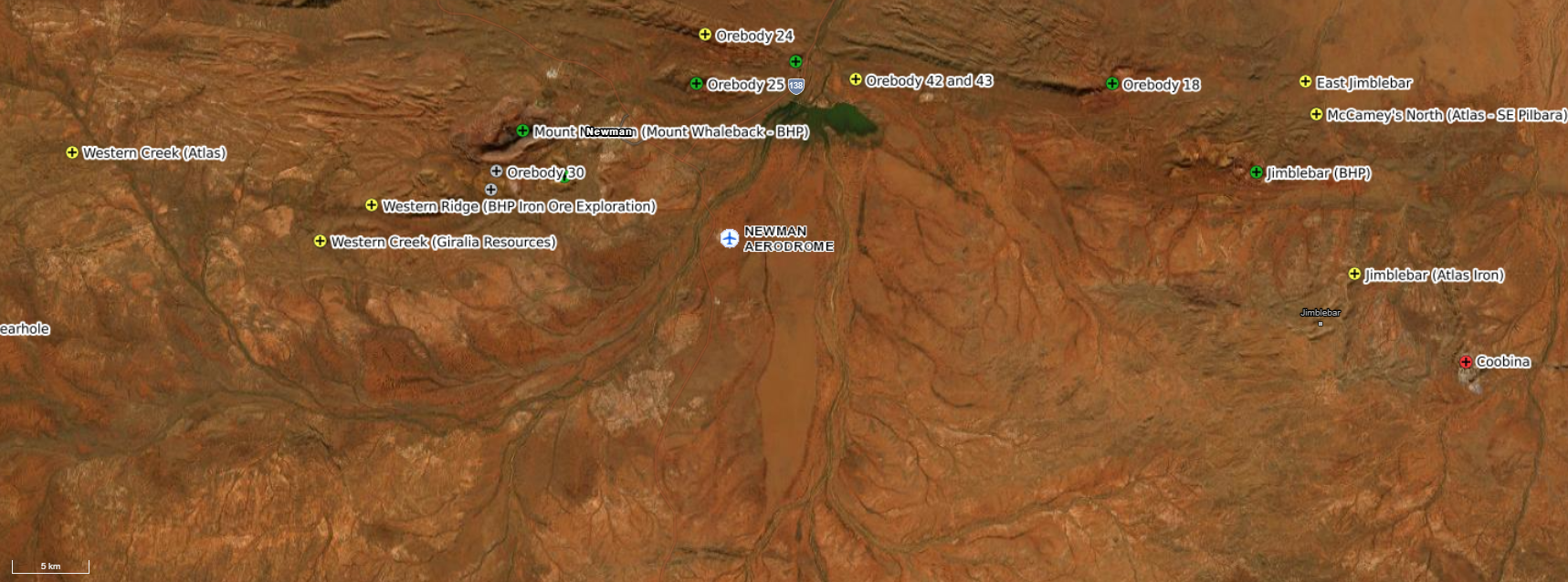 Newman Airport in the foreground, with the town of Newman ahead of it, about two-thirds of the image up. The town is approximately 11 kilometres away from the airport by road, which would take just over 10 minutes to cover. The Mount Whaleback mine, which is majority-owned by BHP, sits just west of Newman and is visible in greater detail below.