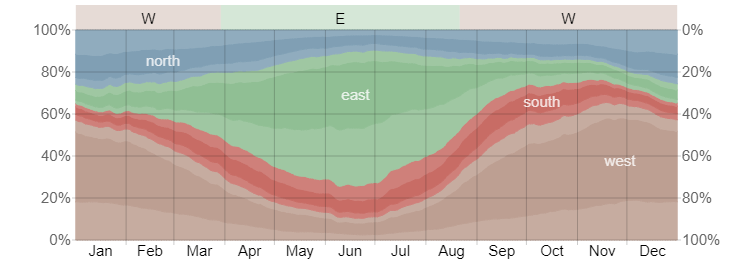 The instrument approaches available into the airport are the RNP 11 and RNP 29 approaches, which are both RNAV approaches with RNP 5 required. The diagram below, courtesy of Weatherspark, shows how during summer months, runway 11 is the most common active runway, with runway 29 taking its place in winter.