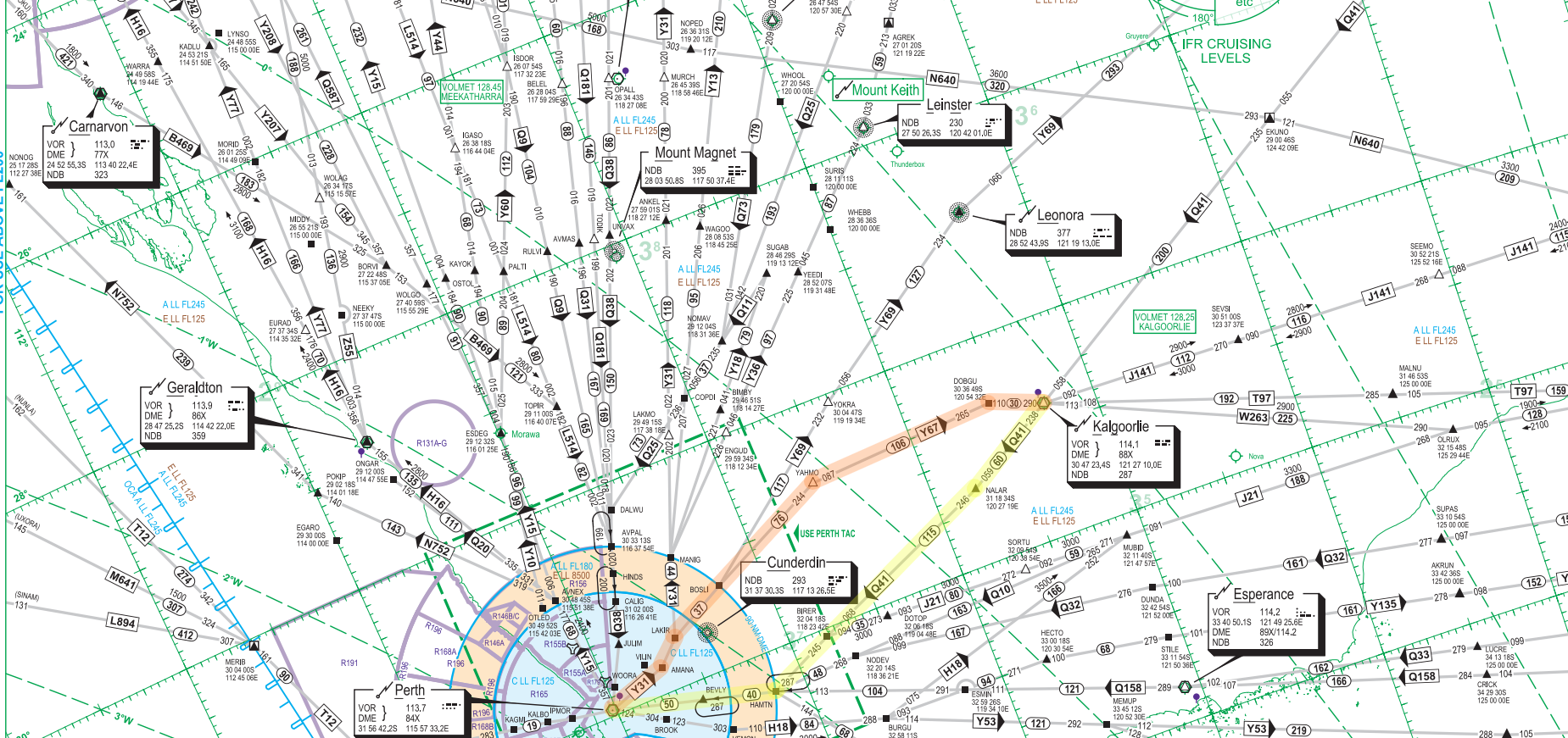 Similarly, there are no standard instrument departures out of Leonora. Pilots will depart in accordance to IFR procedures and establish themselves on the departure track outbound from the Leonora VOR. Once safely airborne and established on the filed routing, they will then contact Melbourne Centre for their airways clearance. The standard routing to Perth would be LEO Z22 MULDM Z38 KELLA DCT BEVLY Q158 PH, linking the Leonora VOR to the waypoint KELLA through the Z22 and Z38 airways, and then a direct segment to BEVLY, where the aircraft will join the BEVLY5A/V/X arrival into Perth, though the flight plan filed will still include the segment to the Perth VOR via the Q158 airway.