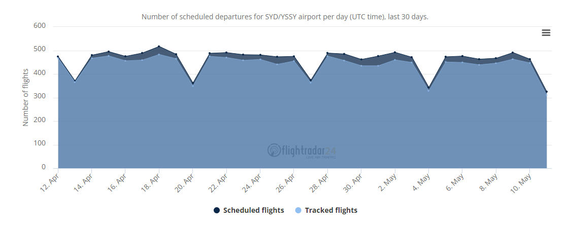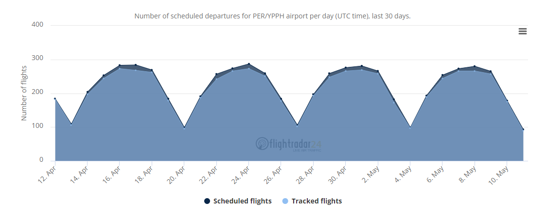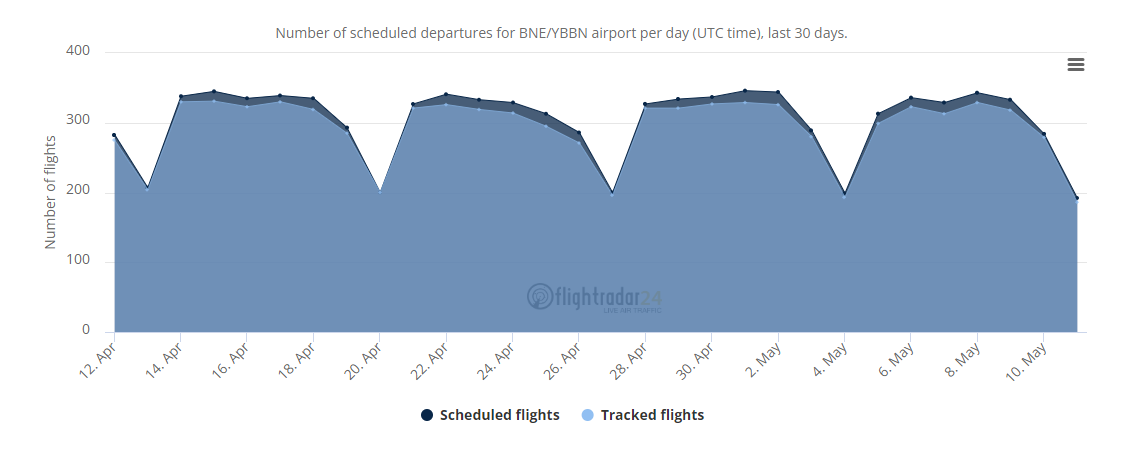 You can see evidence of this from the 4 graphics below courtesy of Fightradar24, which show the general patterns for the number of tracked departures at Sydney, Melbourne, Brisbane and Perth across a week. Perth, with a large fraction of its departures being FIFO traffic, sees a very significant dip over the weekends as compared to Melbourne and Sydney. Brisbane sees a slightly larger dip than Melbourne and Sydney, and that is because there is indeed also FIFO traffic out of Brisbane, albeit at a smaller scale than Perth.