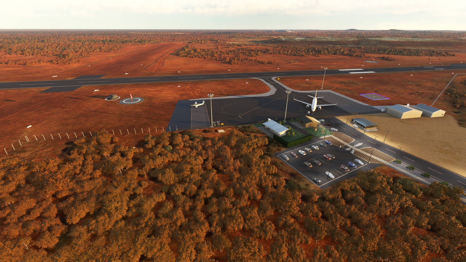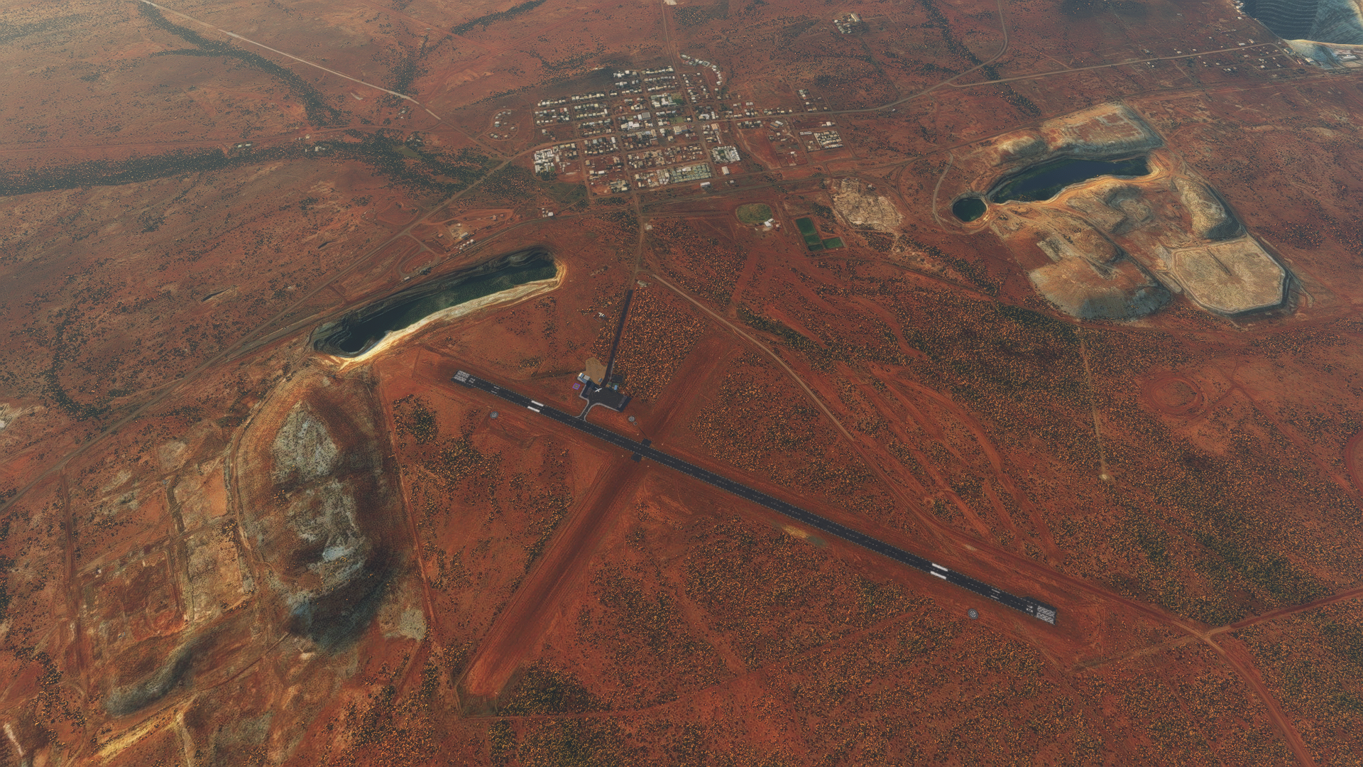 The current version of Leonora is done by CoolGunS, and represents the real-life airport fairly accurately, with the main asphalt runway and the dirt runway, the small parking lot and various small buildings that make up the airport, as well as Rajah Street that leads up to the town of Leonora.