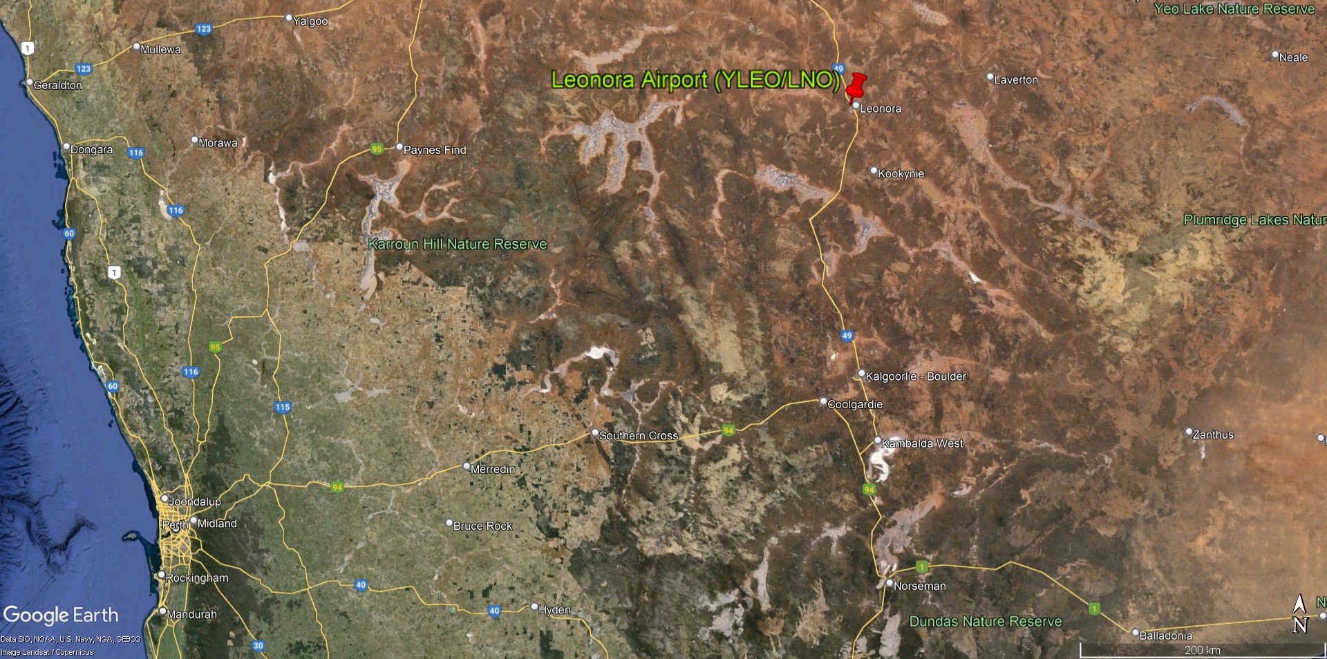 The airport is located just about 615 kilometres on a bearing of 57 degrees from Perth airport. It receives about 9 flights per week from Perth, which is just over 1 flight a day on average. Virgin Australia services the route with 737-700s, while Alliance Airlines does so with Fokker 70/100s. The flight time from Perth is just about 1 hour tracking northeast over the Wheatbelt into the Goldfields-Esperance region. The standard airways routing from Perth to Leonora is PH Y31 KARAB Y69 LEO, with the aircraft leaving controlled airspace on descent tracking towards the Leonora VOR, before establishing itself on an instrument approach or visual circuit.